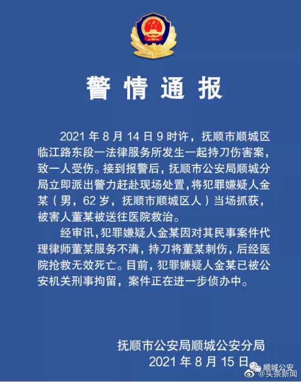 辽宁抚顺一女律师被委托人刺伤身亡:嫌疑人对其服务不满
