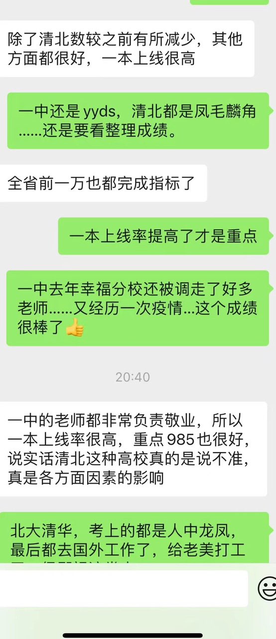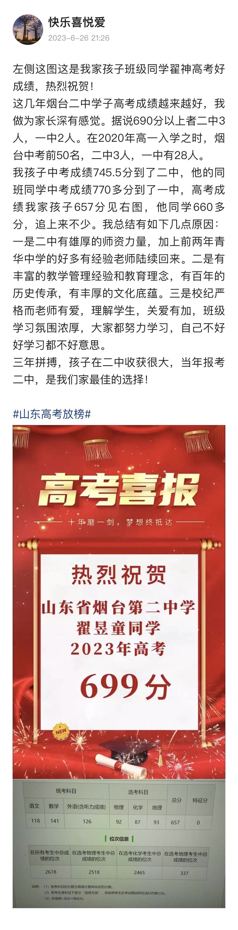 二中的一位家长发的孩子中考和高考时的成绩,家长很满意