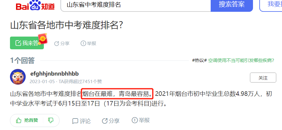 烟台的中考录取分数就不再赘述了,令我惊呆的是青岛中考竟然只有语数英三科计分,其他科目按照等级形式赋分,等级赋分会让孩子和家长省力省心太多!而且百度截图竟然明确了烟台的中考难度大!