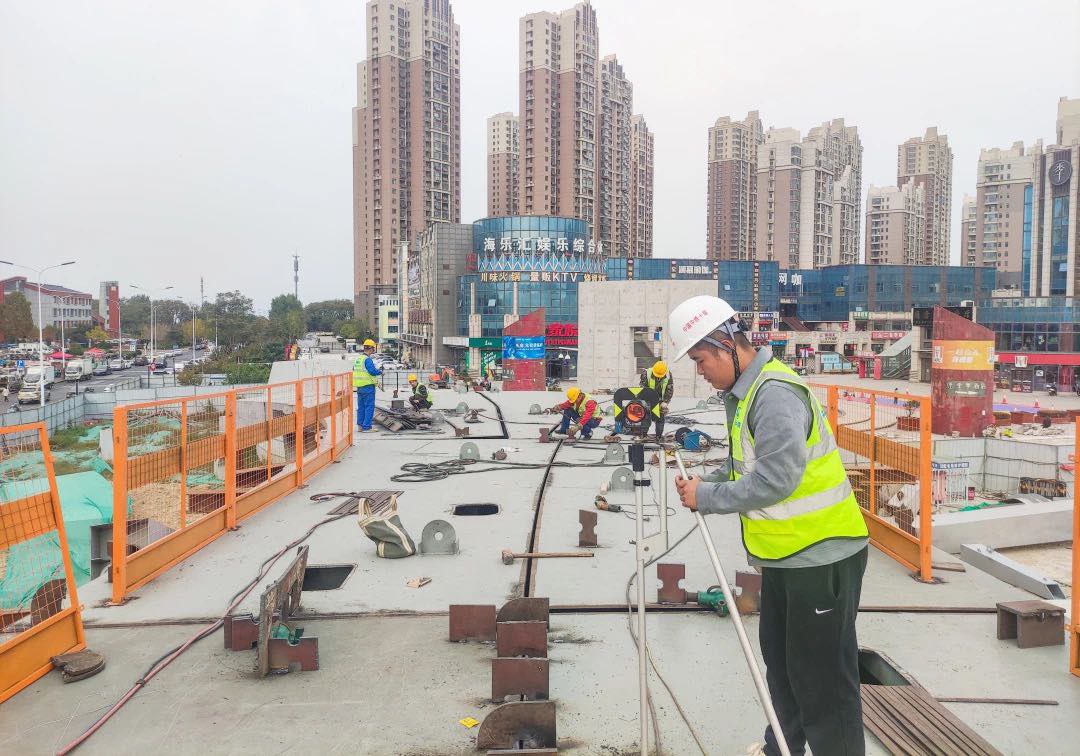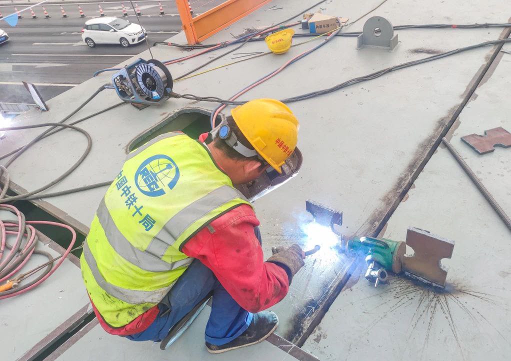 “由于地下管线较为复杂,前期花费了较长的时间对管线进行迁改。北京路作为城市主干路,过街天桥的吊装及焊接方案,我们最终选择在宽度为40.2米的道路上设置2处临时支墩进行吊装施工。天桥焊接采用二氧化碳保护焊,为防止焊渣掉落,白天进行远离公路侧焊接,晚上加班进行跨路段焊接。”过街天桥项目相关负责人介绍。