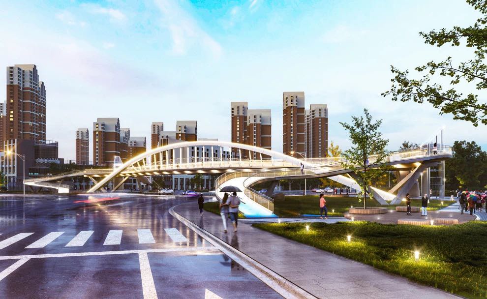 过街天桥兼顾美观与实用,采取银月的设计概念,单跨钢拱的优雅曲线如一道银雪弯月划过海湾上空,与向北3公里的中国(山东)自由贸易试验区烟台片区弧形拱门相呼应,呈现出黄渤海新区的热情与好客,开放与包容的形象。目前,天桥桥梁主体已安装完毕,接下来进行坡道及梯道吊装施工,随后进行钢拱及电梯安装施工,以及铺装和钢拉杆安装。