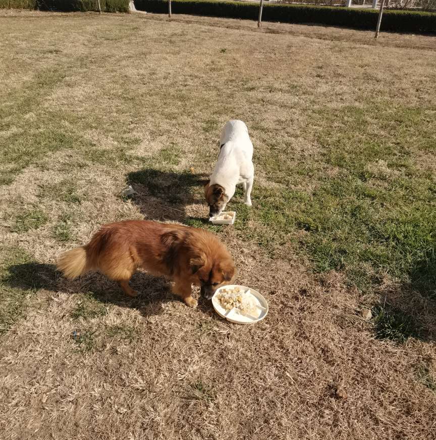 现在,每天早上,无论天有多么冷,调皮的黄部长,一直都在公司大门口等着我。不管我是骑自行车,还是骑电动车,不管我包裹地有多严实,黄部长都能第一时间认出我来。在我打卡的时候,他匍匐在地,等着我。然后,跟着我,到白部长待的地方,他们一起撒着欢,等着我给他们娘俩的早餐。