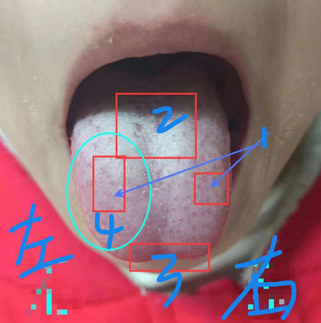 标记2.舌中后区苔厚腻,小孩出现苔厚腻一定是有积食,大多数睡觉不安稳,口臭,大便酸臭等等