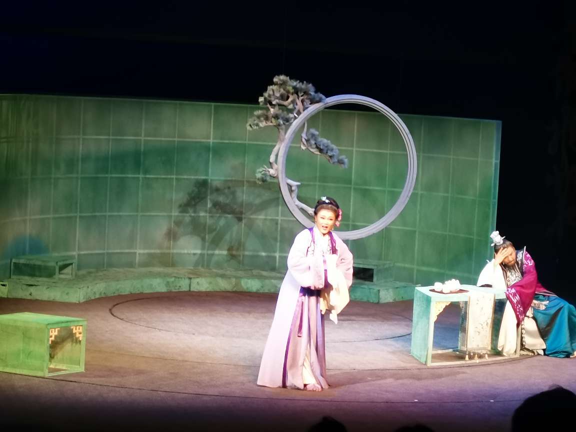 其实,这是一场不拉幕的舞台戏。每一场戏的舞台情景转移,都是通过舞台上,两个可以做环形移动的,类似于弧形屏风的道具,来完成场景的变换。同时,不但是这两个由自动装置控制的弧形屏风,可以配合情节的进展,而实现自动的移动,而且,舞台的中央部分,也是由两块可以原地转动的环形玉璧状台面组成的。道具可以移动,舞台可以转动,在传统戏曲表演上,这是未曾有过的,至少是我未曾亲见过的。