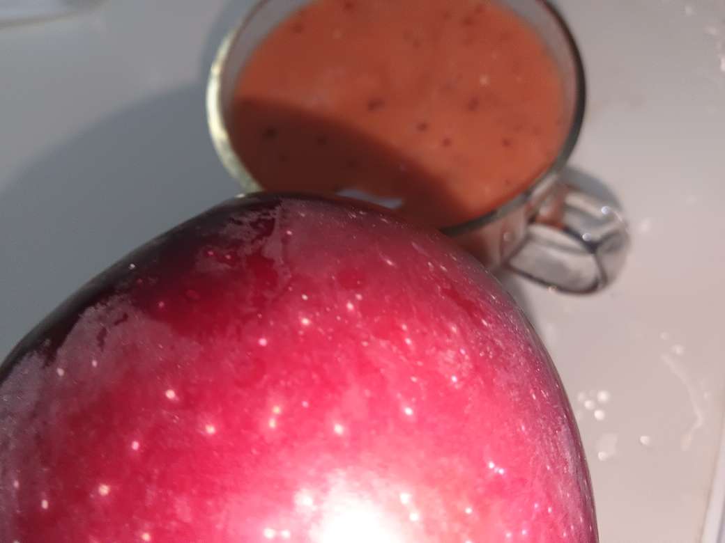 没削苹果皮,一个苹果洗干净后直接切块,加了三分之一个胡萝卜,二分之一个土豆,一个个头适中的西红柿,小半杯温热的水,打成了两杯满满/三个半杯的果蔬汁。