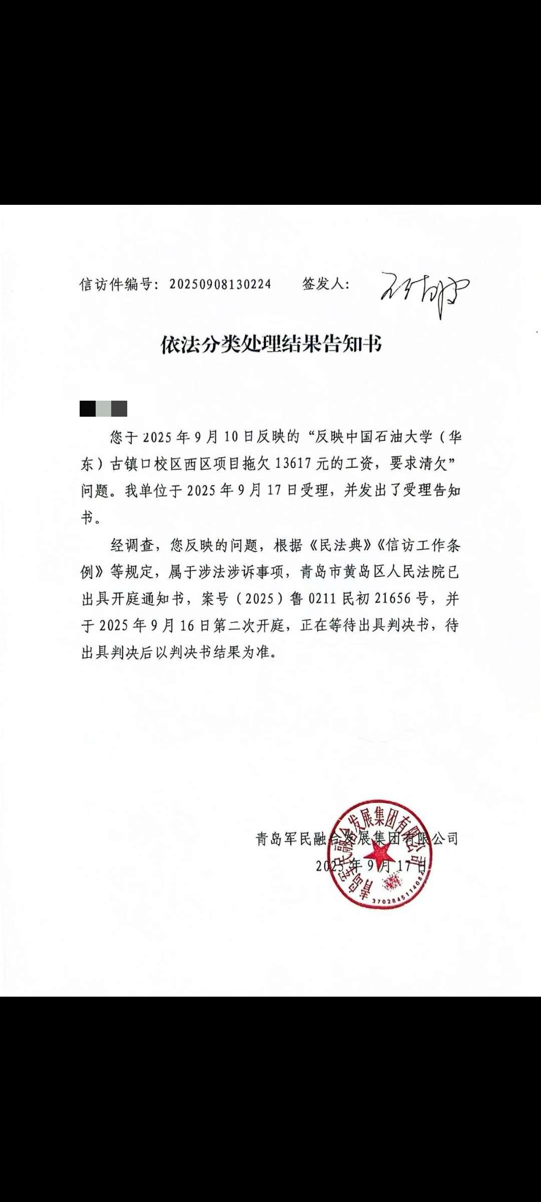本人父亲在青岛市西海岸新区中国石油大学华东校区中铁建工集团古镇口项目部被拖欠工资13617元,已经一年多了,先后打了几十次青岛市长热线,至今未收到一分钱的工资,马上年底了,请领导为我们农民工做主!!!